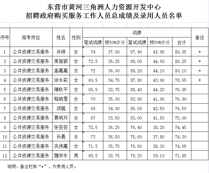 根據(jù)本次招聘活動(dòng)的安排,現(xiàn)將進(jìn)入面試人員的總成績(jī)及錄用人員名單予以公布。望被錄用人員按照統(tǒng)一規(guī)定和要求辦理相關(guān)錄用手續(xù)。