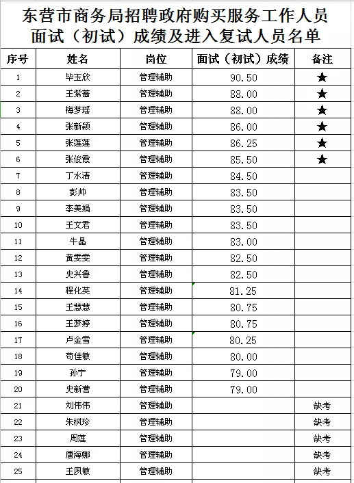 根據(jù)有關(guān)規(guī)定要求和本次招聘活動的統(tǒng)一安排,現(xiàn)將《東營市商務(wù)局招聘政府購買服務(wù)工作人員面試(初試)成績及進入復(fù)試人員名單》予以公布,請查閱。